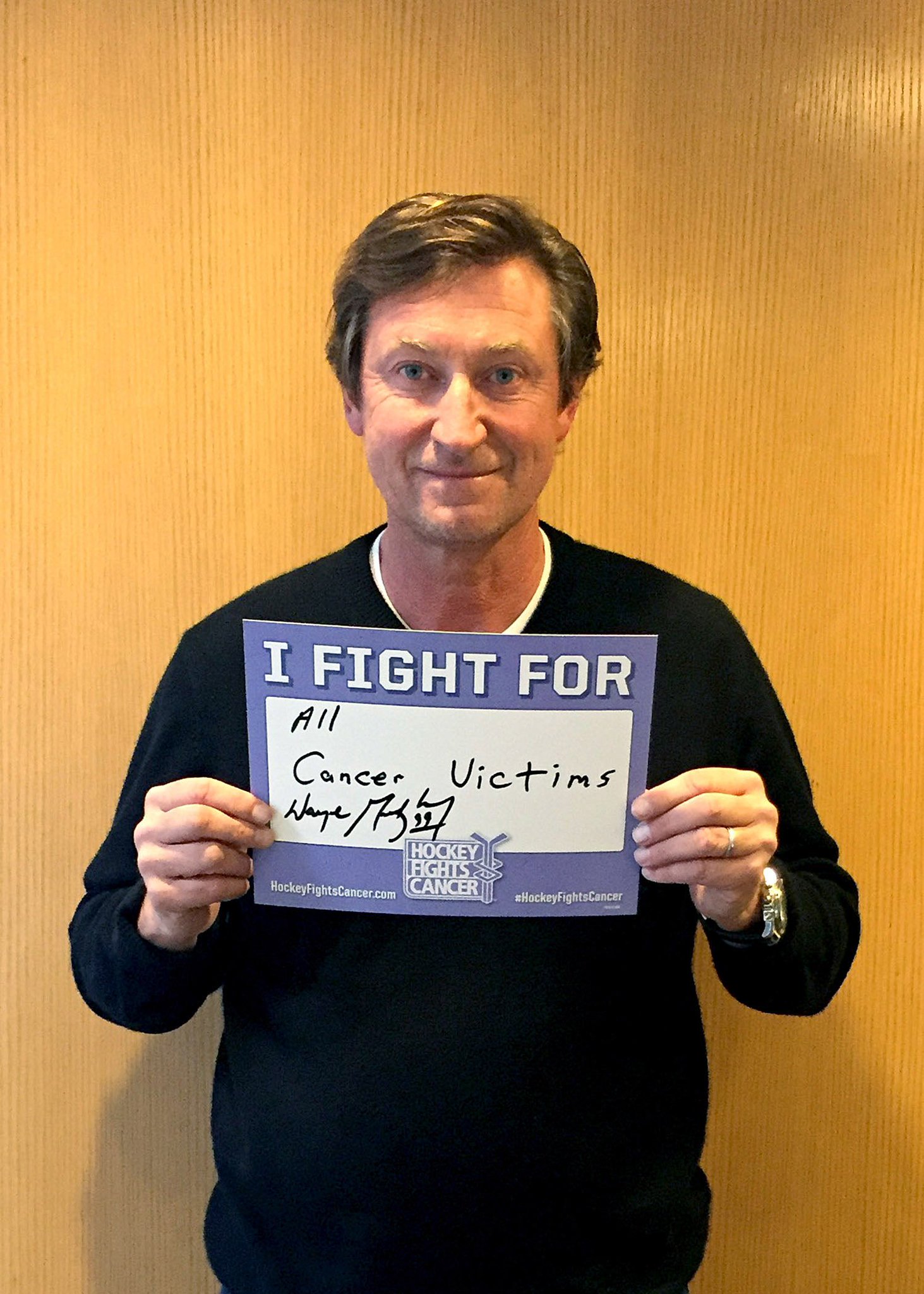 Gretzky posed with a Hockey Fights Cancer "I FIght For" sign and wrote "All cancer victims" with an autograph.