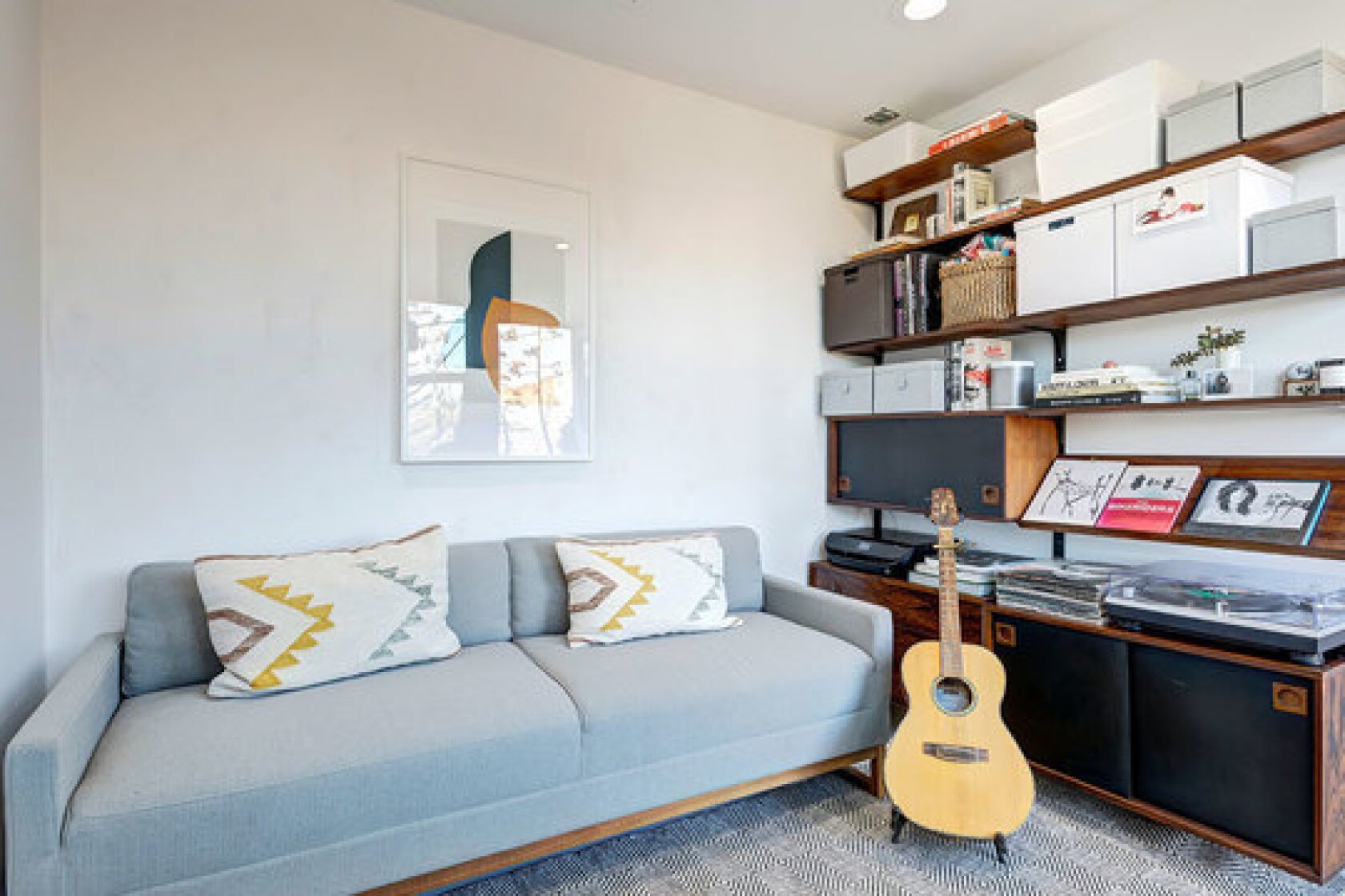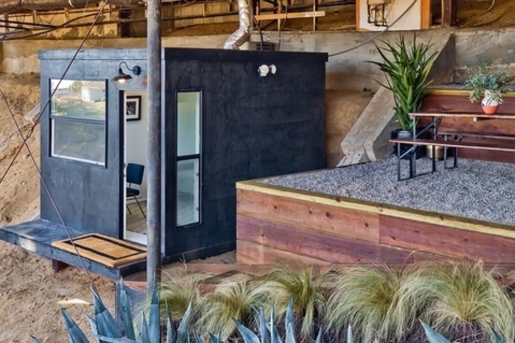There are two bedrooms, two bathrooms and a den. A detached studio sits a few steps down the hill at the back of the house.